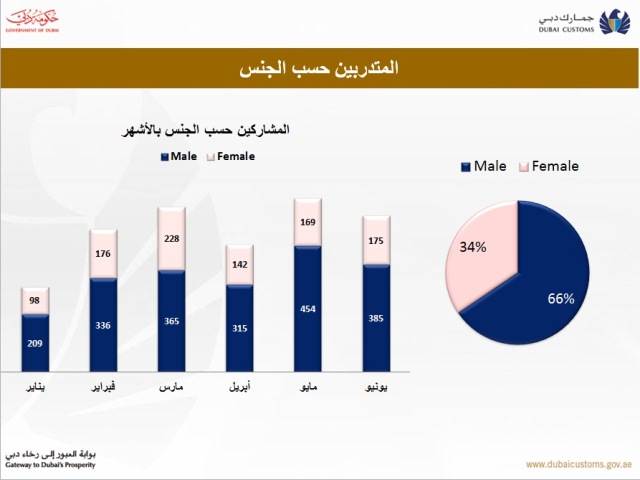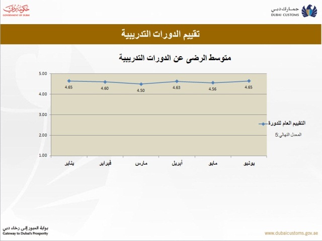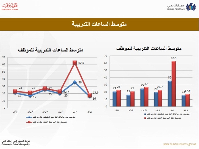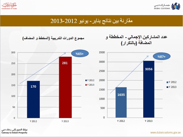 واستهدفت خطة مركز التدريب الجمركي لعام 2013 كافة الدرجات الوظيفية وشملت 91% من موظفي جمارك دبي. وحقق المركز نتائجاً ملموسة خلال النصف الأول من هذا العام ، حيث تمكن من تسجيل زيادة في عدد الدورات التدريبية بشكل عام خلال هذه الفترة بنسبة 65%.