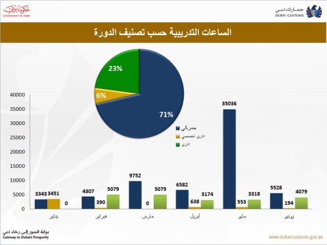 وبلغت نسبة الدورات التدريبية الجمركية 71% من إجمالي عدد الساعات التدريبية خلال النصف الأول من عام 2013 وبزيادة تصل نسبتها إلى 120% مقارنة بنفس الفترة من العام الماضي، في حين بلغت نسبة الدورات الإدارية 23% ونسبة الدورات التخصصية 6% من إجمالي عدد الساعات التدريبية خلال هذه الفترة وبزيادة وصلت نسبتها إلى 46% مقارنة بنفس الفترة من العام الماضي.