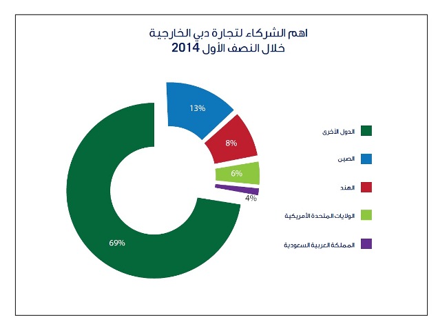 وتتنوع قائمة الأسواق التي تشملها تجارة دبي الخارجية لتشمل شركاء من مختلف قارات العالم، تتقدمهم الصين التي بلغت قيمة التجارة معها في النصف الأول من العام 2014 نحو 80.5 مليار درهم، تلتها الهند بقيمة 53 مليار درهم، ثم الولايات المتحدة بقيمة 41 مليار درهم، والسعودية بقيمة 27 مليار درهم.