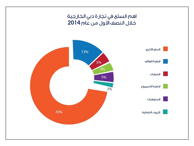ودعم هذا التنوع في البضائع استمرار دبي في موقعها المتقدم على خارطة التجارة العالمية، حيث بلغت قيمة تجارتها الخارجية في النصف الأول من العام 2014 نحو 654 مليار درهم، توزعت إلى الواردات بقيمة 408 مليار درهم، والصادرات بقيمة 59 مليار درهم، وإعادة التصدير بقيمة 187 مليار درهم .