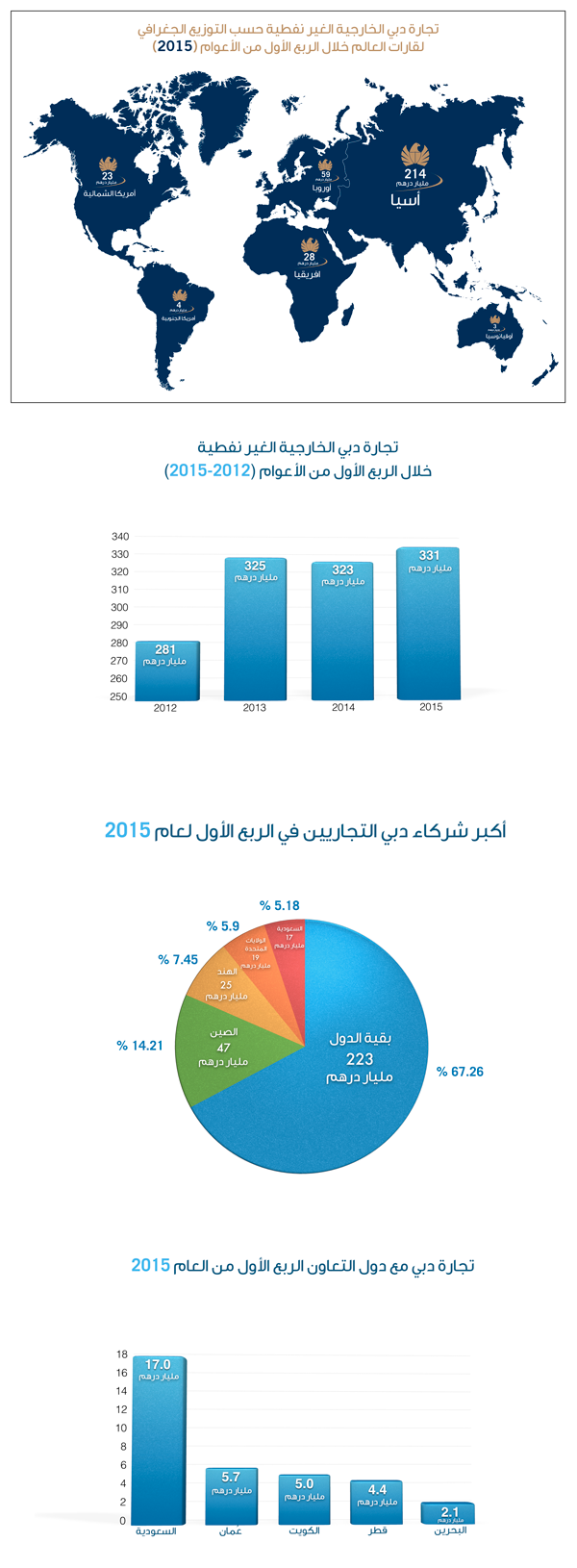 نجحت دبي في تعزيز النمو بتجارتها الخارجية بدعم من التطور المتصاعد في البنية التحتية للإمارة وكفاءة الخدمات التجارية والجمركية التي تقدمها للتجار والمستثمرين، وقد بلغت قيمة تجارة دبي الخارجية خلال الربع الأول من العام 2015 نحو 331 مليار درهم، محققةً نمواً بنسبة 3% مقارنةً بالربع الأول من العام الماضي، والذي بلغت فيه 323 مليار درهم.