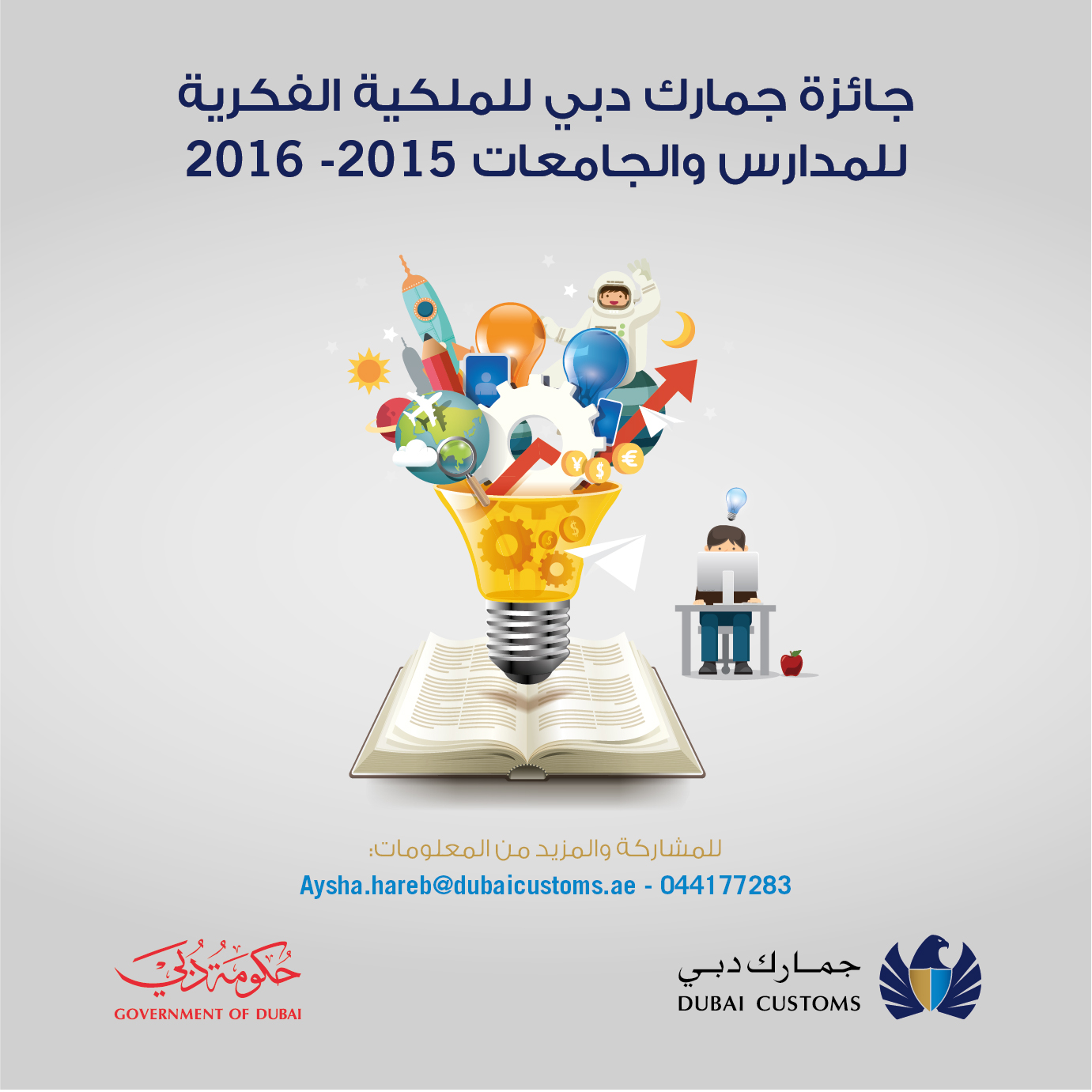 تعزيزاً لثقافة الإبداع والابتكار لدى الأجيال الجديدة، أطلقت جمارك دبي الدورة التاسعة لجائزة الملكية الفكرية للمدارس والجامعات للعام الدراسي 2015 – 2016، بهدف نشر التوعية والتثقيف بحقوق الملكية الفكرية، وتشجيع الطلبة على الإبداع والابتكار لتوصيل مفهوم الملكية الفكرية، والتحذير من مخاطر البضائع المقلدة على المجتمع، حيث يمكن لطلبة الجامعات والمدارس المشاركة في الجائزة ضمن ست فئات للتوعية بحقوق الملكية الفكرية؛ هي: فئة أفضل حملة توعوية، وفئة أفضل موقع إلكتروني، وفئة أفضل ابتكار أو اختراع لحماية حقوق الملكية الفكرية، وفئة المشاركة بالجائزة بتأليف كتاب أو قصة حول هذه الحقوق، وفئة المشاركة بمسرحية قصيرة تتناول مخاطر السلع المقلدة، وفئة إعداد فيلم قصير عن الملكية الفكرية.