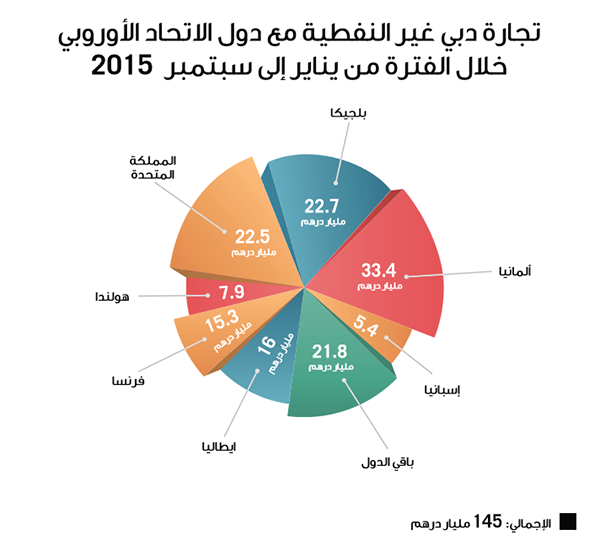بلغت قيمة تجارة دبي غير النفطية مع دول الاتحاد الأوروبي في التسعة أشهر الأولى من عام 2015 نحو 145 مليار درهم؛ توزعت بين واردات بقيمة 113 مليار درهم، وصادرات بقيمة 7.1 مليار درهم، فيما سجلت قيمة إعادة التصدير 24.8 مليار درهم.