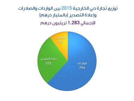 أعلن سمو الشيخ حمدان بن محمد بن راشد آل مكتوم، ولي عهد دبي رئيس المجلس التنفيذي أن إجمالي التجارة الخارجية غير النفطية لدبي خلال العام 2015، بلغت قيمتها نحو 1.283 تريليون درهم؛ بواقع 796 مليار درهم للواردات، و132 مليار درهم للصادرات، و355 مليار درهم لإعادة التصدير.