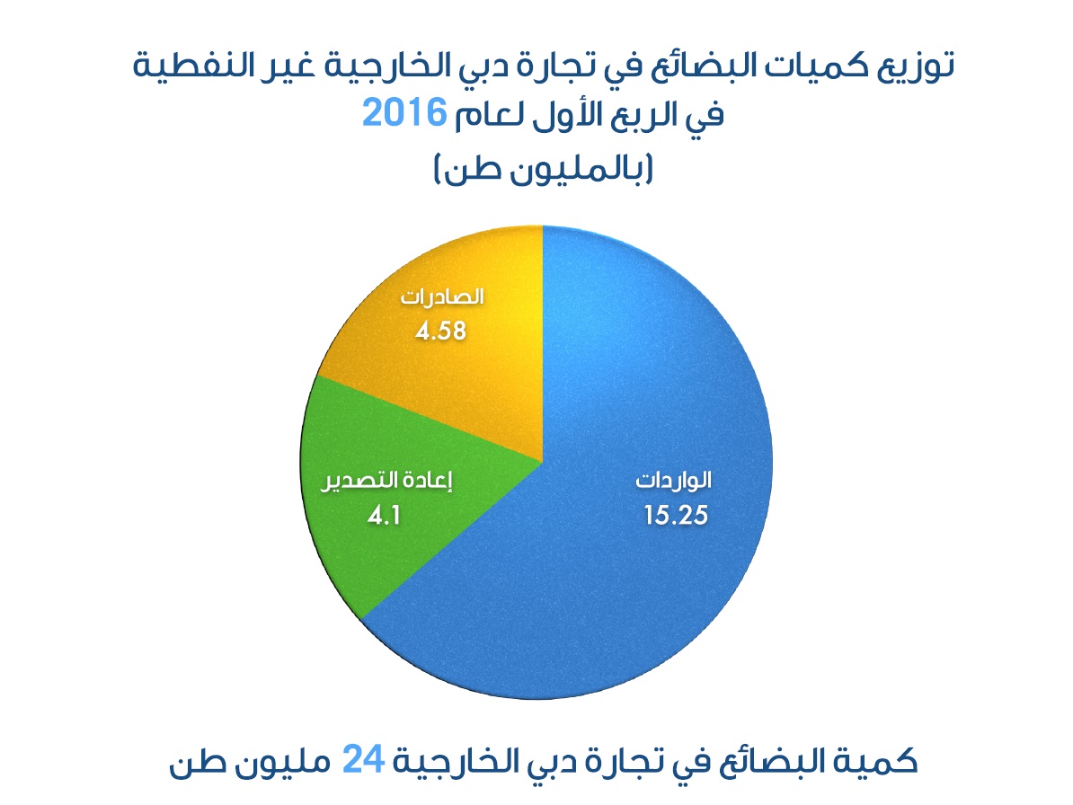 سجلت دبي نمواً لافتاً في كمية البضائع لتجارتها الخارجية غير النفطية خلال الربع الأول من عام 2016، بنسبة 17%، مقارنة مع نفس الفترة من العام الماضي، ليصل وزنها – وفقاً لإحصائيات جمارك دبي - إلى 24 مليون طن، وذلك نتيجة لنمو كمية بضائع إعادة التصدير بتجارة دبي الخارجية بنسبة 35% لتصل إلى 4.1 مليون طن، ونمو كمية بضائع الصادرات بنسبة 26% لتصل إلى 4.58 مليون طن، ونمو كمية بضائع الواردات بنسبة 11% لتصل إلى 15.25 مليون طن.