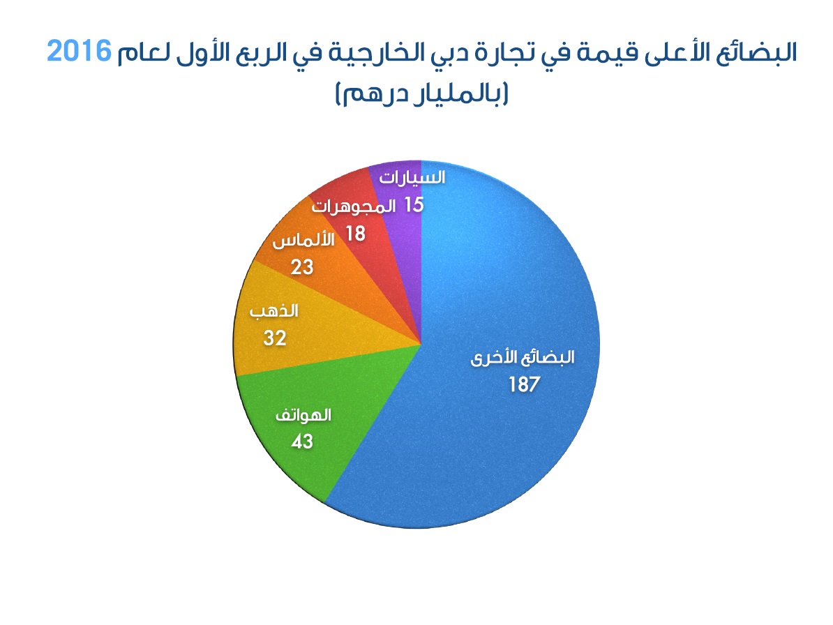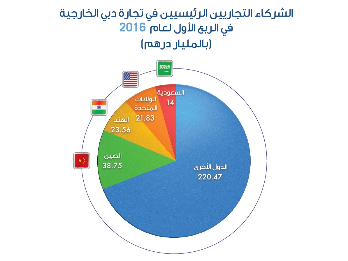 وبلغت قيمة تجارة دبي الخارجية غير النفطية في الربع الأول من العام 2016 نحو 319 مليار درهم، توزعت إلى الواردات بقيمة 196 مليار درهم، والصادرات بقيمة 36 مليار درهم، وإعادة التصدير بقيمة 87 مليار درهم.