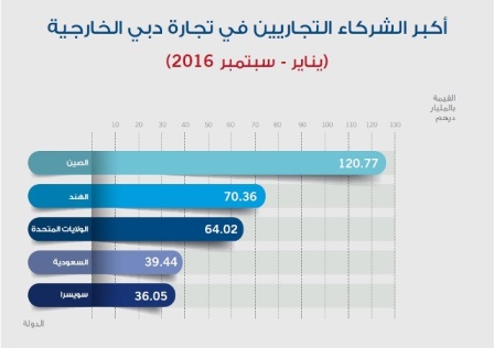 وتقدمت الصين إلى مركز الشريك التجاري الأول لدبي، حيث بلغت قيمة تجارة الإمارة مع الصين في الأشهر التسعة من يناير إلى سبتمبر من العام 2016 نحو 120.8 مليار درهم، وجاءت الهند في مركز الشريك التجاري الثاني لدبي بقيمة 70.4 مليار درهم تلتها الولايات المتحدة الأمريكية في مركز الشريك التجاري الثالث، وقد سجلت تجارة دبي الخارجية معها في الأشهر التسعة من يناير إلى سبتمبر من العام 2016 نموا بنسبة 6% لتصل قيمتها إلى 64 مليار درهم، وحافظت المملكة العربية السعودية على موقع الشريك التجاري الأول لدبي خليجياً وعربياً والرابع على مستوى العالم بقيمة 39.4 مليار درهم، فيما جاءت سويسرا في مركز الشريك التجاري الخامس لدبي، حيث قفزت تجارة دبي الخارجية معها في الأشهر التسعة من يناير إلى سبتمبر من العام 2016 لتسجل نمواً بنسبة 64% وبلغت قيمتها 36 مليار درهم.