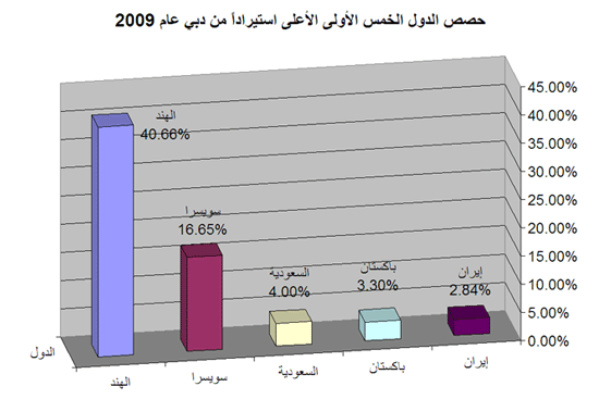 وبشئ من التفصيل حول أهم البضائع والمنتجات التي استوردتها هذه الدول الخمس من دبي خلال عام 2009، نجد أنه بالنسبة للهند، فقد جاء الذهب في مقدمة صادرات دبي إليها، بقيمة 19.04 مليار درهم وبنسبة 89.33% من إجمالي هذه الصادرات، ثم الخردة والمعادن الصالحة للصهر، بقيمة 693.37 مليون درهم وبنسبة 3.25% من الصادرات، وجاء النحاس في المرتبة الثالثة، بقيمة 396.06 مليون درهم، وبنسبة 1.86% من الصادرات، أما المنتجات الأخرى فبلغت قيمتها 1.185 مليار درهم، وبنسبة 5.56%.