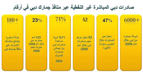 سجلت صادرات دبي المباشرة غير النفطية في عام 2009 نموا نسبته 23% مقارنة بعام 2008، حيث ارتفعت قيمة هذه الصادرات عبر منافذ جمارك دبي إلى 52.4 مليار درهم خلال عام 2009 مقابل 42.6 مليار درهم عام 2008، في الوقت الذي بلغ فيه معدل النمو خلال السنوات الخمس الأخيرة 47% .وأكد سعادة / أحمد بطي أحمد الرئيس التنفيذي لمؤسسة الموانئ والجمارك والمنطقة الحرة، مدير عام جمارك دبي أن الإستراتيجية التي انتهجتها دولة الإمارات العربية المتحدة في ضرورة الإهتمام بتنويع القاعدة الإنتاجية والأنشطة الإقتصادية وتوطيد العلاقات التجارية والإقتصادية مع مختلف دول العالم، كان لها الأثر الفعال في جذب الإستثمارات وازدهار حركة التبادل التجاري مع العالم الخارجي، وتعزيز موقع الدولة كبوابة تجارية رئيسية للعالم في منطقة الشرق الأوسط.