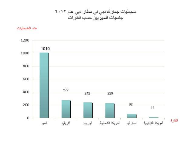Mr Ali AL-Maghawi, Director of Airport Operations Department at Dubai Customs revealed that the percentage of seizures has been trickled down in 2012 at 15% comparable to 2011, these improved statistics stand to reflect good reputation of Dubai Customs’ image worldwide in term of interdicting almost smugglers’ attempts and refrain them from infiltrating such prohibited items into the country, adding to that the awareness campaigns as led by Dubai Customs through the audio-visual, browse and network media have influentially educated passengers about classification of these items and restriction of their entry into the country and spread awareness of their health, economy and social potential risks.