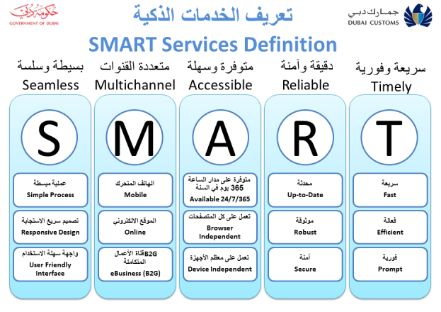 As a result of transforming and being recognized as the first 100% SMART government department, Dubai Customs conducted a survey on its SMART services which were released earlier on October 3rd. The satisfaction survey indicated that DC’s services are 90% Seamless, 100% Multi-channelled, 84% Accessible, 89% Reliable and 82% Timely. Overall, DC’s customers are 88% pleased with the mechanism through which the services are delivered.