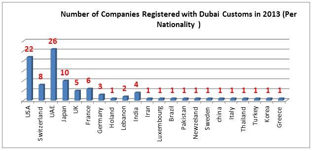 Dubai Customs witnessed a mounting surge in trademarks registration from international companies. According to 2013 statistics, US companies spearheaded the list with 83 trademarks divided over 22 companies; followed by 44 Swiss trademarks from 8 companies, 35 Japanese trademarks from 10 companies, 22 UK trademarks from 5 companies, 13 French trademarks from 6 companies, 12 German trademarks of 3 companies, in addition to 41 trademarks from other countries. On the other hand, 43 local trademarks were lodged by 26 domestic companies.