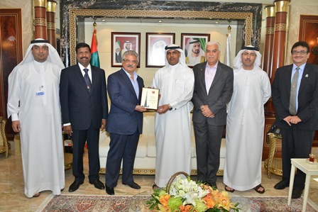 Mr Deepak J Babani, CEO of Eros Group, presented H.E. Ahmed Mahboob with the group’s trophy, in the presence of Abdullah Al Khaja, Executive Director of Customer Management Division, Edris Bahzad, Director of Client Management Department, and Khalfan Rashed Al Keaibi, Manager of Customer Service Management. On the other hand, the delegation from Eros Group comprised Niranjan Gidwani, Deputy Executive Officer, P. Ravichandran, Associate Vice President, and A. Manavalan, Assistant Manager.