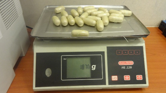 Suspicions of the Customs inspectors were affirmed, and through the followed legal Customs procedures, 33 heroin-stuffed capsules were taken out of the first suspect and 40 were taken out of the second, amounting to a total of 477 capsules, weighing 5.2kg of heroin, all recovered from the guts of the seven passengers at the airport and the hospital to which they were transferred.