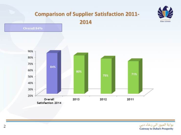 Dubai Customs has scored high above average in a recent supplier satisfaction survey, as the total rate of satisfied suppliers hit 84% in 2014 with an increase of 4% compared to 2013. The survey was conducted jointly by DC’s Strategy and Corporate Excellence Department and the Administration Affairs Department, in cooperation with an external research company.
