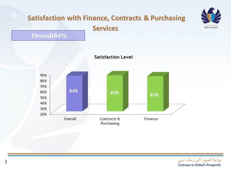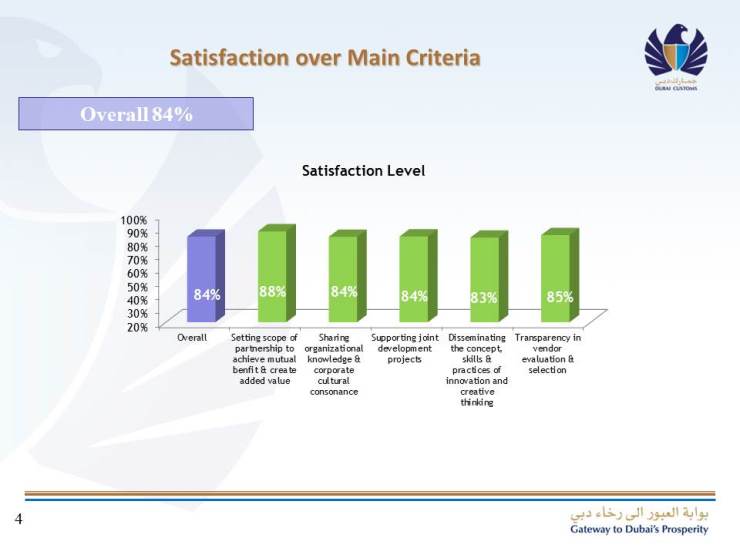 “Dubai Customs has seen a noticeable improvement in supplier satisfaction in terms of putting in place streamlined supply transactions, scoring 85%. Vendors’ satisfaction over developing techniques to improve the quality of contracts was 86%, while satisfaction over supporting joint development projects was measured at 84%. The survey also revealed that DC’s initiatives pertaining to supplier needs analysis scored 81% satisfaction. Moreover, 83% of the surveyed were satisfied with Customs measures for disseminating the concept, skills, and practices of innovation and creative thinking.”