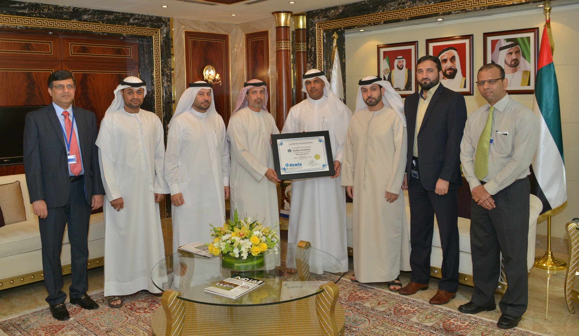 H.E. Ahmed Mahboob Musabih, Dubai Customs Director received ‘CMMI’ appraisal scores from Juma Al Ghaith, Executive Director of Customs Development Division, upon receiving the project’s team comprising Younis Othman, Information Technology Director, Ahmed Al Yaqoubi, Projects Delivery Director, and Bader Al Kharoosi, Systems Delivery Section Manager.