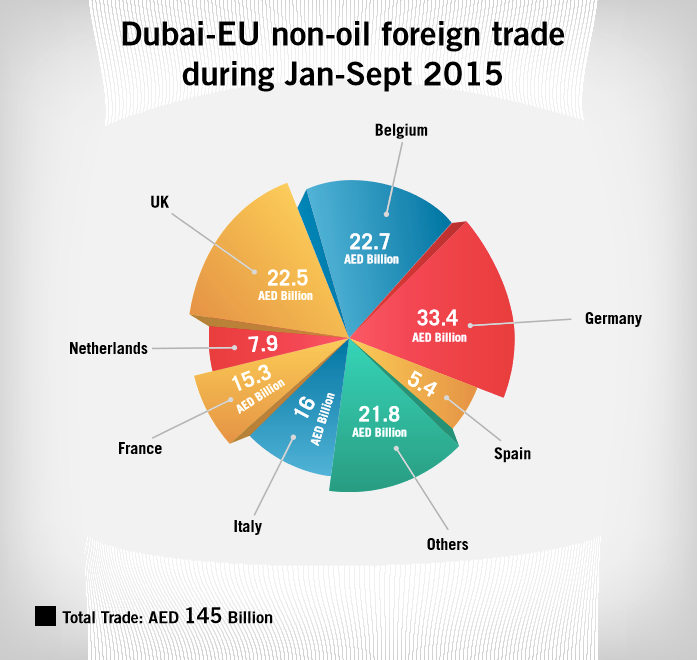 Non-oil trade between Dubai and EU countries hit almost AED 145 billion from January through September 2015, with imports accounting for AED 113 billion, exports for AED 7.1 billion while re-exports represented AED 24.8 billion.