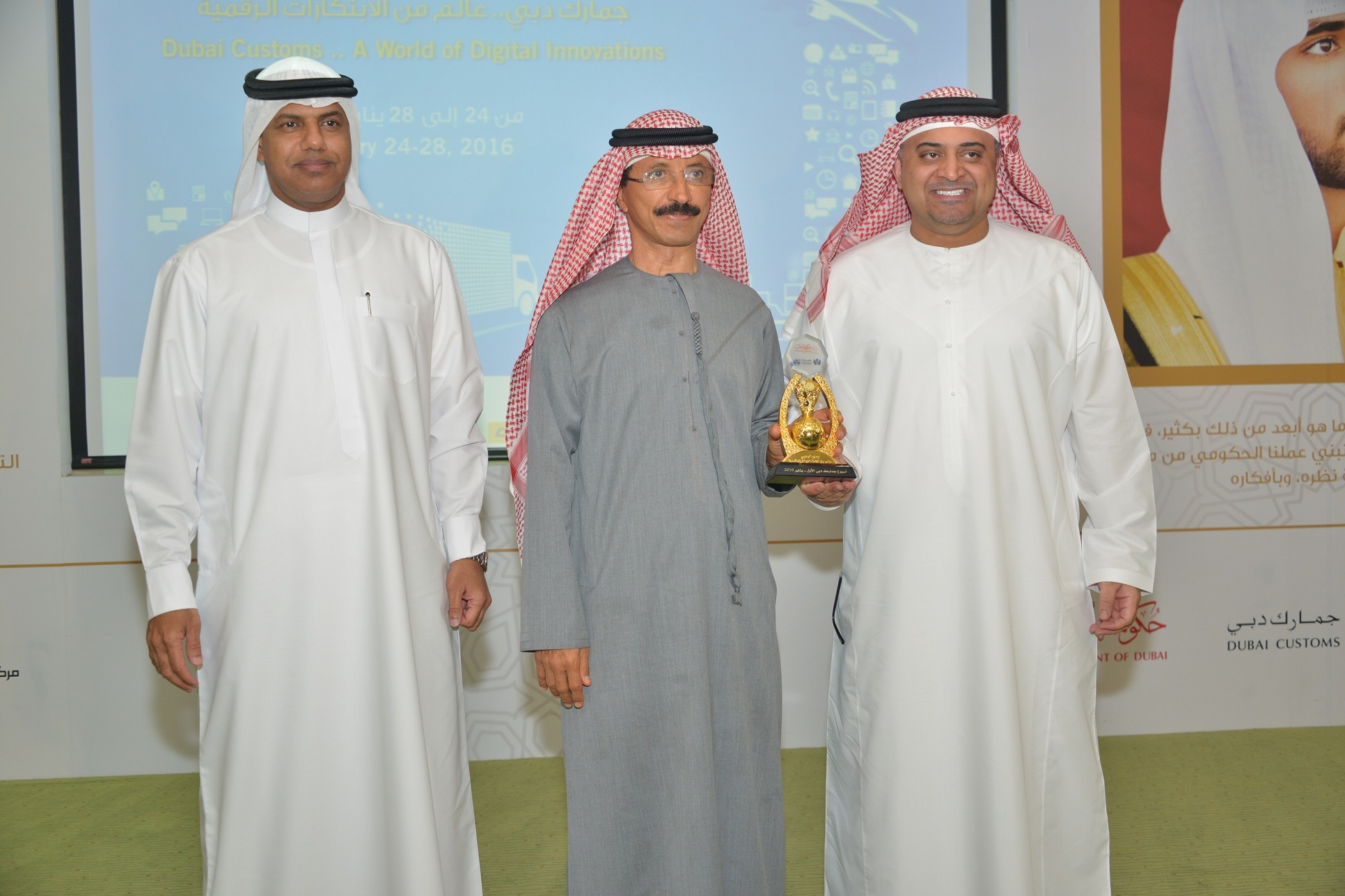 Bin Sulayem and Ahmed Musabih presented Hani Al Hamli with a trophy. At the end of the ceremony, the audience toured an exhibition, organised by Dubai Customs at its headquarters which showcased the history, projects and innovations of DC.