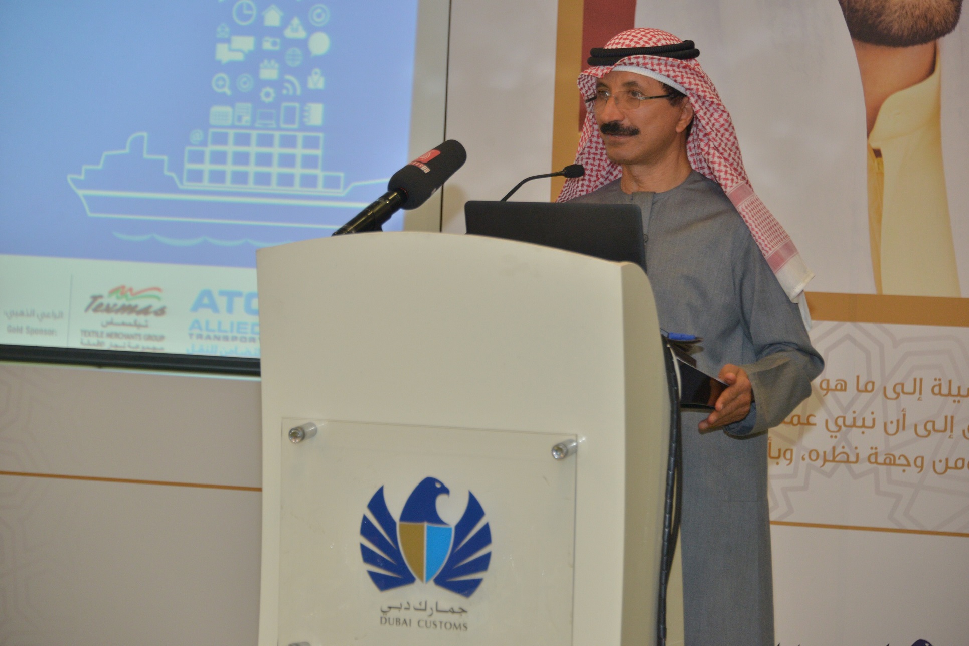 The 1st Dubai Customs Week is held with the platinum sponsorship of ATC Allied Transport and Texmas Textile Merchants Group, gold sponsorship of Eros Group, Danzas, Al Naboodah and Swadan Trading Co., and silver sponsorship of Dubai Gold & Jewellery Group.