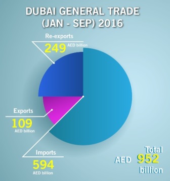 Dubai saw a 11 per cent surge in the total volume of traded goods in the first nine months of 2016, rising as high as 70.82 million tons of commodities. Imports had the lion’s share at AED 594 billion (46.81 million tons and 12% increase), while exports and re-exports accounted for AED 109 billion (11.84 million tons and 8% increase) and AED 249 billion (12.17 million tons and 10.5% increase), respectively. This pushes the total value of Dubai’s trade up to AED 952 billion.