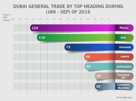Next on the list was gold with AED 116 billion worth of trade, followed by diamonds at AED 73 billion, and jewelry at AED 46 billion.