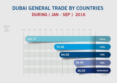 With a bilateral trade worth AED 120.8 billion, China was — by far — Dubai’s primary trading partner in the first 9 months of 2016. India came in second with bilateral trade at AED 70.4 billion. The USA followed with AED 64 billion trade value, which means a 6% increase compared to the first 9 months of 2015.