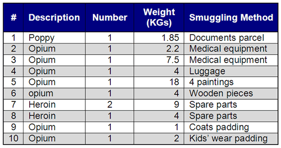 It is worth noting that inspectors of DCV Inspection Center managed to seize over 53.5 kg of narcotics within the first seven months of 2010. There were 10 seizures that contained opium, heroin and poppy which were hidden using different smuggling techniques such as documents parcels, luggage, medical instruments, artistic paintings, spare parts, coats and kids’ wear.