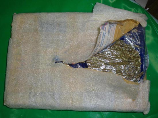 When the parcel was passed through the X-Ray equipments, density in some places has been noticed. This necessitated a manual inspection to be carried out for the shipment where two pieces wrapped with a sponge cover and other two plastic and carbon covers have been found. The inspector suspected to be narcotic substances, being wrapped in such a way with the intension of misleading.